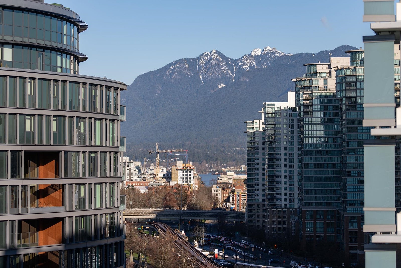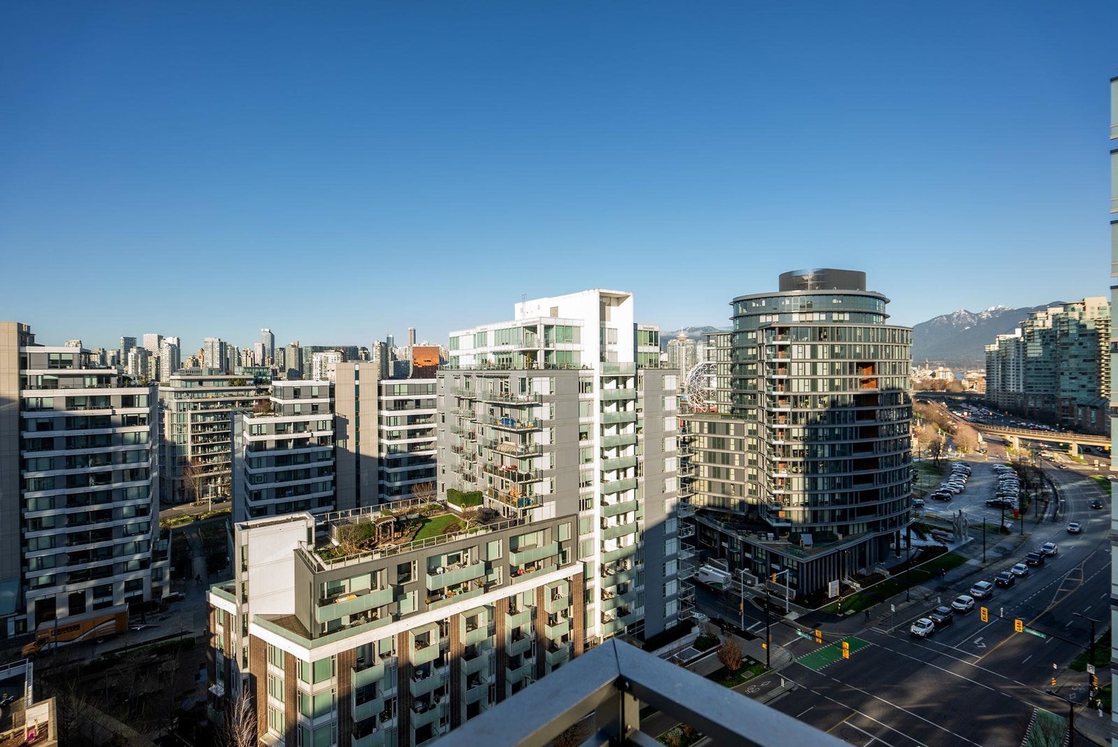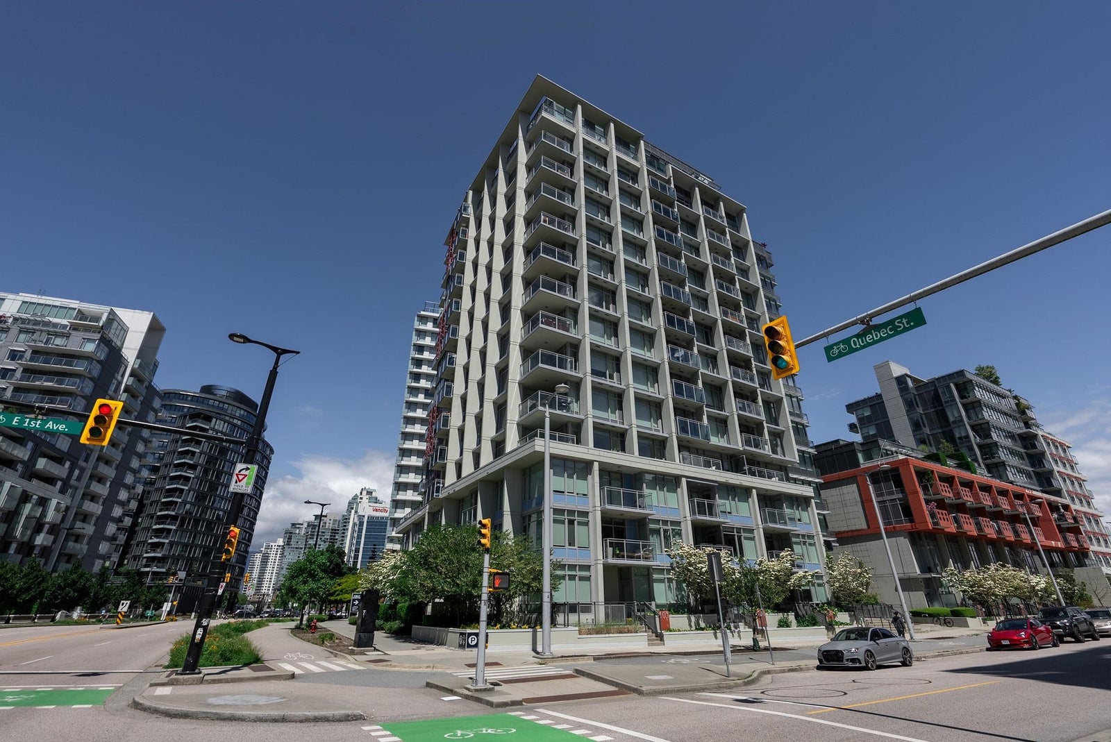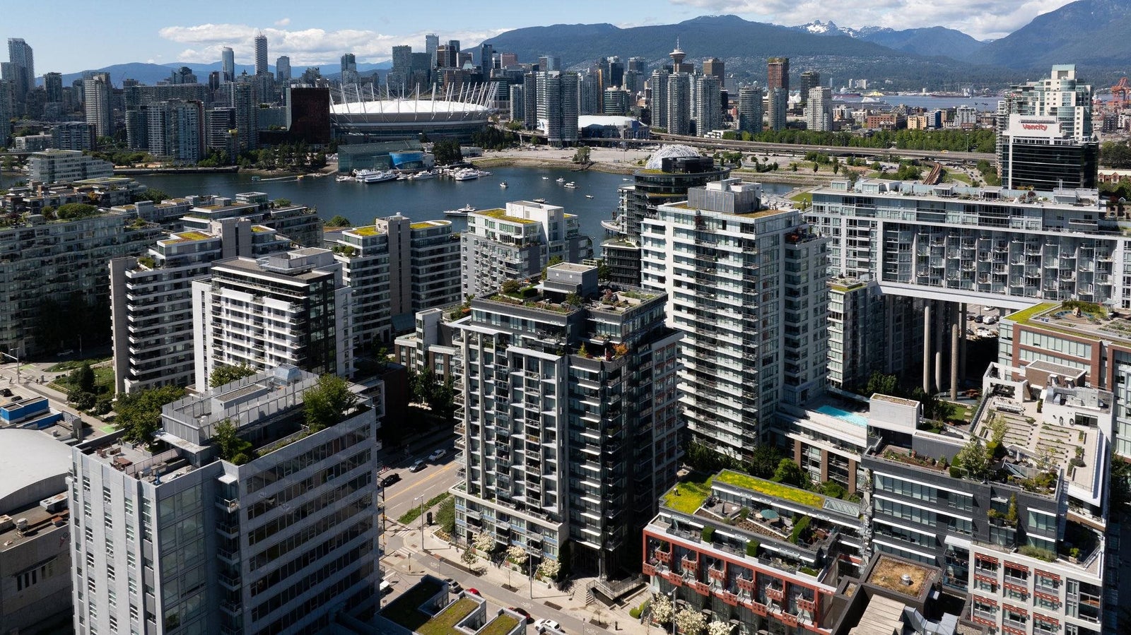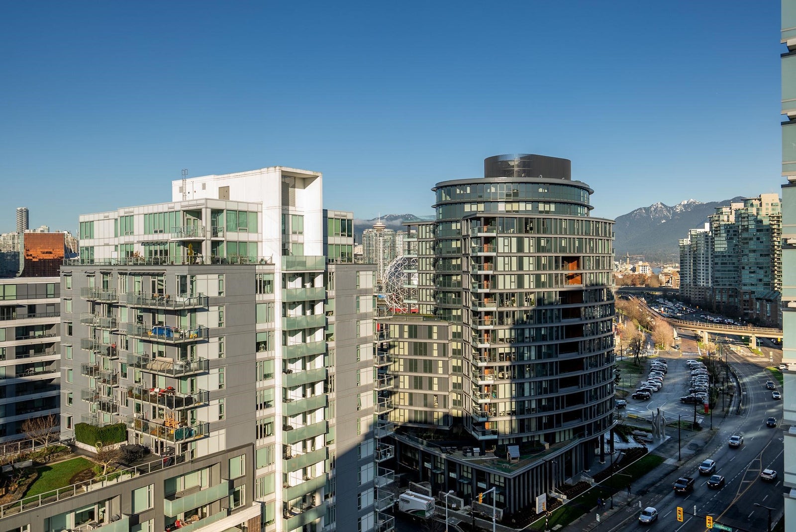 Welcome to the NW sub-penthouse at 'Block 100!' This stunning 3bed/2bath home comes with all the bells & whistles & has no wasted space in the nearly 1200sf that it has to offer. Kitchen & both bathrooms have been tastefully updated w/chic cabinetry, stone counters, gas cooktop, full size s/s and integrated appliances, and smart tech toilets. Boasting 10' ceilings throughout the entire home & offering beautiful partial views of Science World, NS Mountains & through to Van Harbour. This exquisite home has AC & comes with a PRIVATE 2car garage & massive 235sf storage room. This well-run buildings offers over 5000sf of indoor/outdoor amenity space incl a gym, 2 lounges & concierge. Situated in the heart of Olympic Village & close to all amenities!
