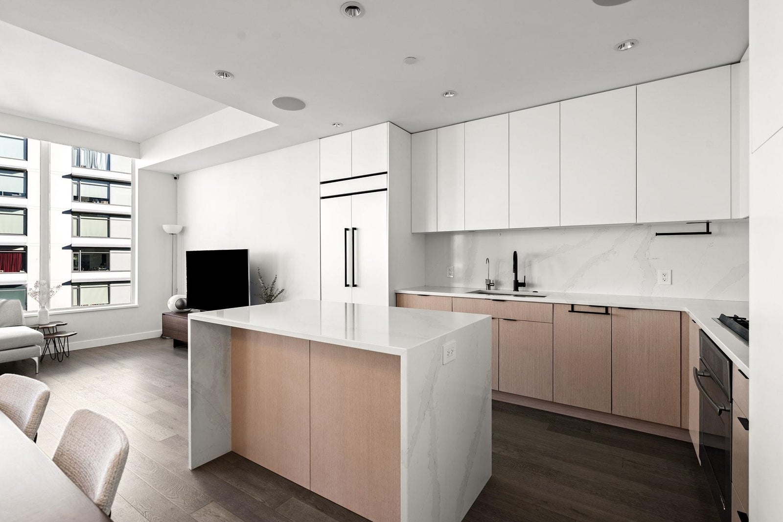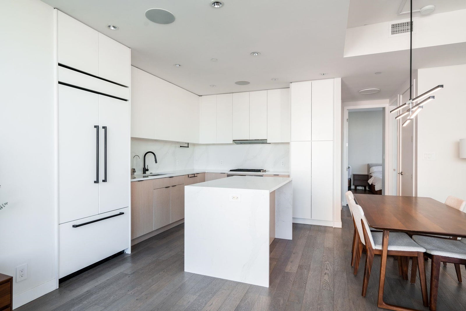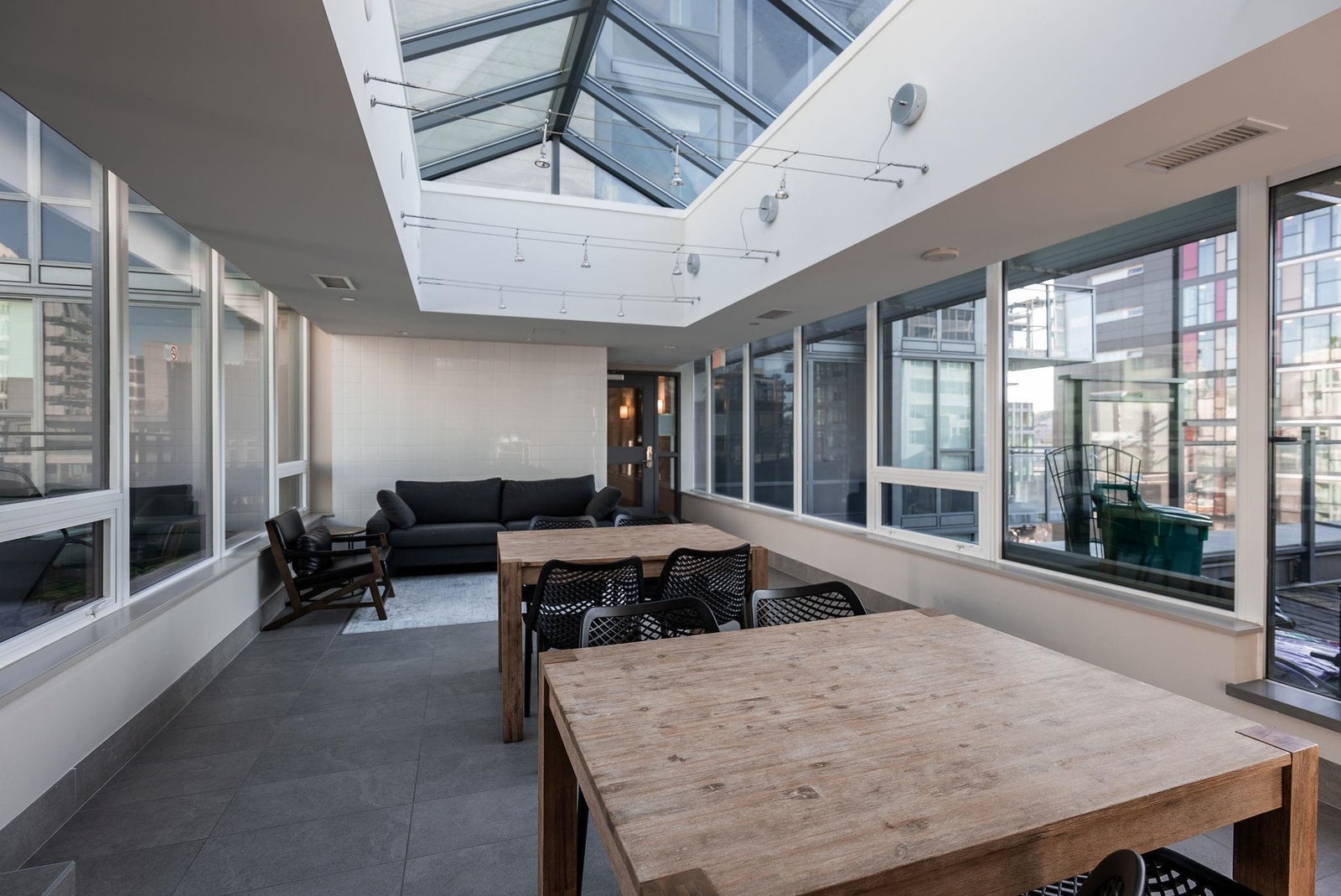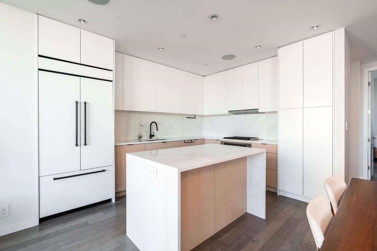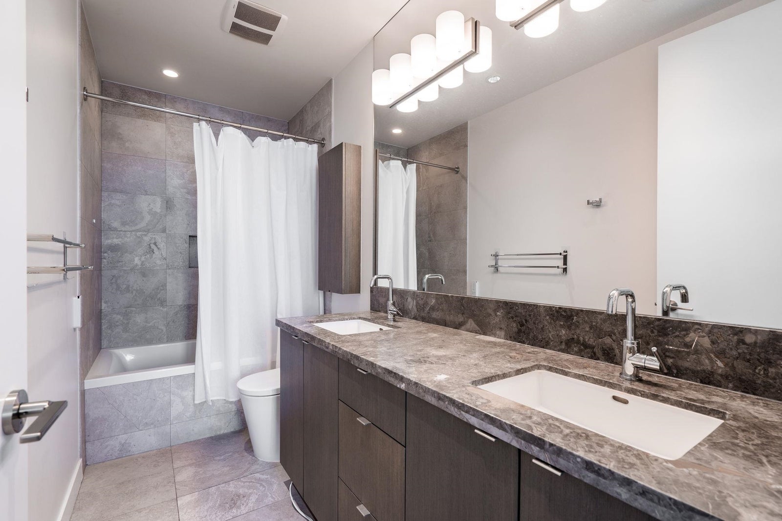 Welcome to the NW sub-penthouse at 'Block 100!' This stunning 3bed/2bath home comes with all the bells & whistles & has no wasted space in the nearly 1200sf that it has to offer. Kitchen & both bathrooms have been tastefully updated w/chic cabinetry, stone counters, gas cooktop, full size s/s and integrated appliances, and smart tech toilets. Boasting 10' ceilings throughout the entire home & offering beautiful partial views of Science World, NS Mountains & through to Van Harbour. This exquisite home has AC & comes with a PRIVATE 2car garage & massive 235sf storage room. This well-run buildings offers over 5000sf of indoor/outdoor amenity space incl a gym, 2 lounges & concierge. Situated in the heart of Olympic Village & close to all amenities!